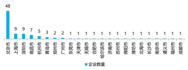 從企業(yè)所屬城市來(lái)看,企業(yè)分布在全國(guó)16個(gè)省份23個(gè)城市。北京的企業(yè)數(shù)量遙遙領(lǐng)先于其他省份,數(shù)量為48家,位居一梯隊(duì),上海市、深圳市、南昌市、杭州市位居第二梯隊(duì)。特別值得一提的是,在北京市48家入圍企業(yè)中,石景山區(qū)有21家,占比超四成。