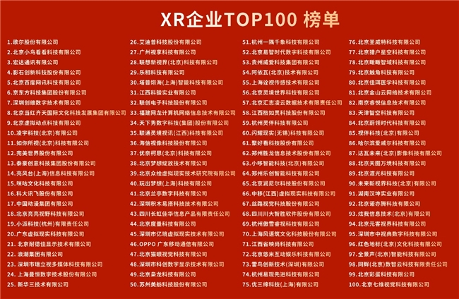 作為本次活動(dòng)的重磅環(huán)節(jié),中國(guó)工程院院士、北京航空航天大學(xué)計(jì)算機(jī)學(xué)院教授、博士生導(dǎo)師、中關(guān)村數(shù)智人工智能產(chǎn)業(yè)聯(lián)盟總顧問(wèn)趙沁平,北京市科學(xué)技術(shù)協(xié)會(huì)副主席郭魯鋼,中關(guān)村數(shù)智人工智能產(chǎn)業(yè)聯(lián)盟副理事長(zhǎng)、秘書(shū)長(zhǎng)賈昊,中國(guó)企業(yè)評(píng)價(jià)協(xié)會(huì)常務(wù)副秘書(shū)長(zhǎng)于越共同發(fā)布《2023XR企業(yè)TOP100榜單》?!癤R企業(yè)TOP100”評(píng)價(jià)工作由中關(guān)村數(shù)智人工智能產(chǎn)業(yè)聯(lián)盟和中國(guó)企業(yè)評(píng)價(jià)協(xié)會(huì)共同發(fā)起開(kāi)展,榜單的發(fā)布能夠挖掘一批虛擬現(xiàn)實(shí)、增強(qiáng)現(xiàn)實(shí)、混合現(xiàn)實(shí)產(chǎn)業(yè)的示范企業(yè),樹(shù)立XR企業(yè)高質(zhì)量發(fā)展的標(biāo)桿,推動(dòng)行業(yè)和企業(yè)健康有序發(fā)展,助力數(shù)字經(jīng)濟(jì)做強(qiáng)、做優(yōu)、做大。