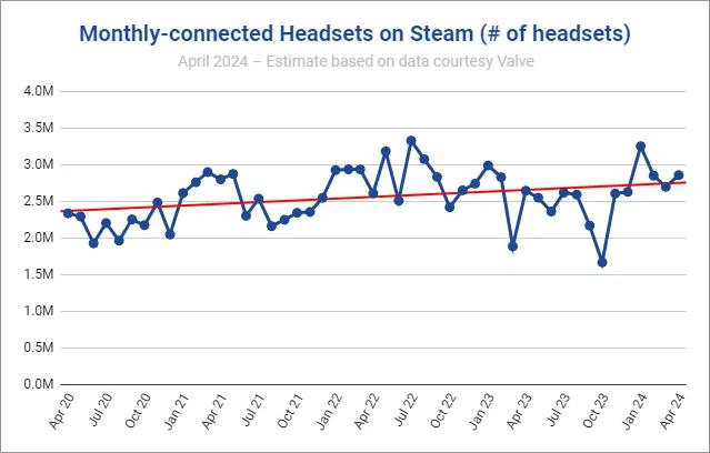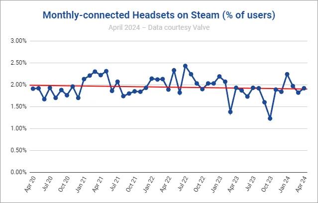 在計算了Steam總體用戶增長后,我們可以看到Steam每月連接的頭顯數(shù)量的緩慢增長情況。