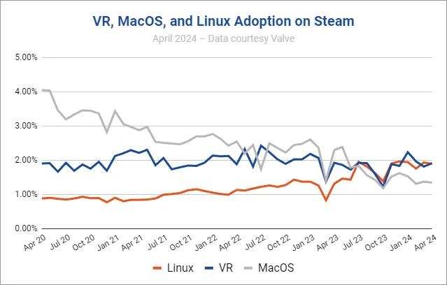 過去四年來,PC VR玩家一直在穩(wěn)定增長。與此同時,MacOS的用戶數(shù)量持續(xù)減少,用戶數(shù)已被超越。