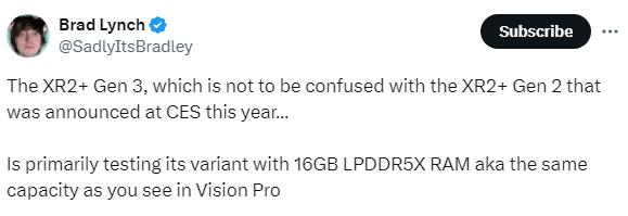 其中,16GB RAM值得注意,這將使XR2+ Gen 3頭顯接近于Apple Vision Pro的處理能力(Vision Pro 也擁有16GB RAM),而后者目前在頭顯性能方面是最具競(jìng)爭(zhēng)力的。因此,頭顯制造商必然渴望XR2+ Gen 3的組合。