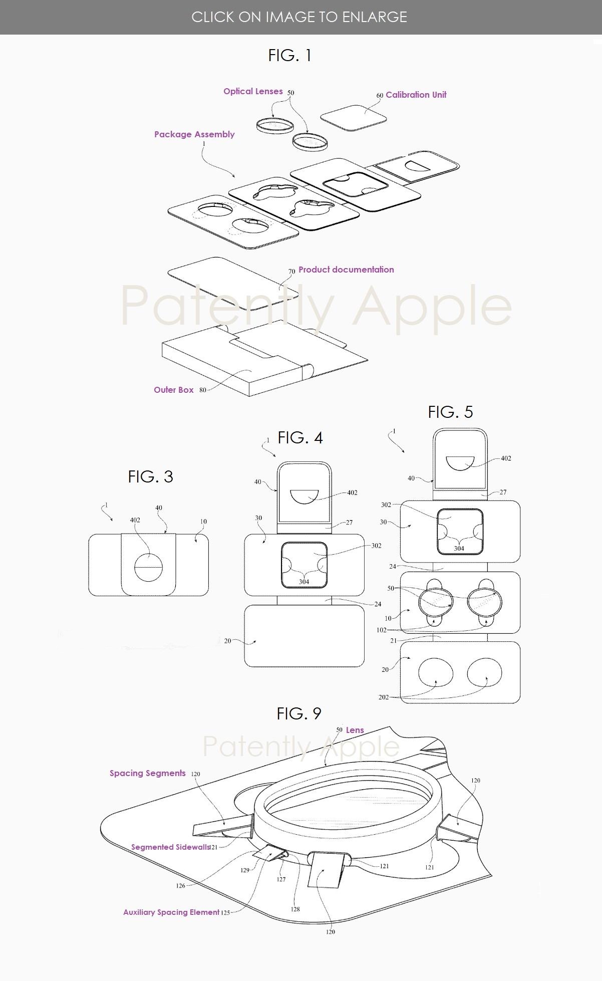 蘋果專利圖1顯示了包裝組件的分解圖,其中包括用于接收產(chǎn)品的包裝#1,例如光學鏡頭#50和產(chǎn)品配件#60(例如校準單元);在一些實施例中,包裝#1可與產(chǎn)品文檔#70(例如使用說明、保修和其他法律信息等)捆綁,并放置在可以接收包裝#1的外盒#80內(nèi);蘋果專利圖3、4和5顯示了包裝#1處于打開的各個階段。