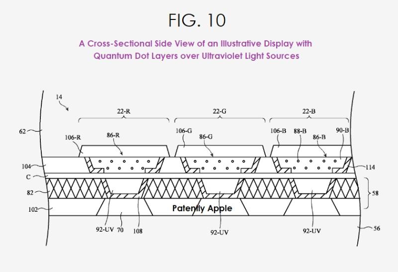 蘋果專利圖10展示了帶有位于紫外線光源上方的量子點層的示例性顯示器的橫截面?zhèn)纫晥D。