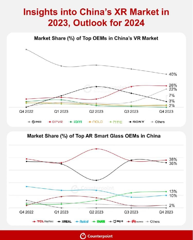 根據(jù)Counterpoint報(bào)道,大朋VR在2023年占國內(nèi)VR市場26%份額,位居第二。海外同樣不遑多讓,大朋VR的客戶已遍布40+海外國家和地區(qū),擁有13000+服務(wù)內(nèi)容開發(fā)者,是一家得到國內(nèi)外雙重認(rèn)可的先鋒VR企業(yè)。