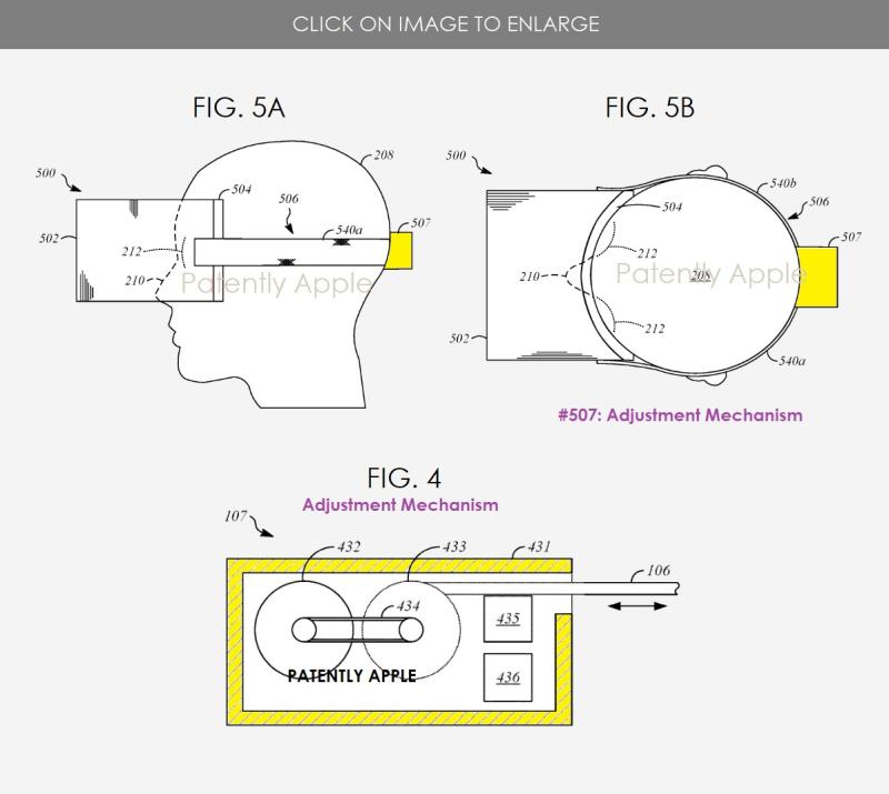 蘋果專利圖5A示出了包括支撐機構(gòu)的頭戴式顯示器側(cè)視圖;圖5B為帶有可調(diào)節(jié)支撐機構(gòu)的頭戴式顯示器頂視圖;圖4為調(diào)節(jié)機構(gòu)的詳細(xì)圖示。