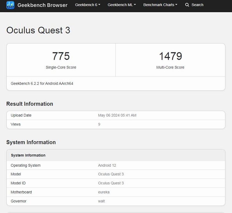 VR愛好者Luna向我們展示了Geekbench測(cè)試結(jié)果,結(jié)果顯示這款代號(hào)為PICO A9210的頭顯具有兩個(gè)2.05 GHz內(nèi)核和四個(gè)2.36 GHz內(nèi)核,而這正是Quest 3 Geekbench跑分內(nèi)容。