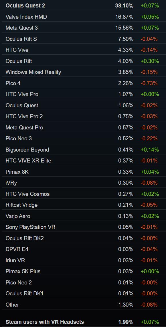 本月Meta陣營設(shè)備占比為66.87%(+0.36%)。細(xì)分來看,Meta Quest 2占比為38.10%(+0.07%),Meta Quest 3升至15.56%(+0.07%),Oculus Rift S為7.50%(-0.04%),DK1為0.01%(-0.00%)、DK2為0.04%(-0.00%)、Meta Quest Pro為0.57%(-0.02%)、Quest為1.06%(-0.02%)、Oculus Rift為4.03%(+0.30%)。