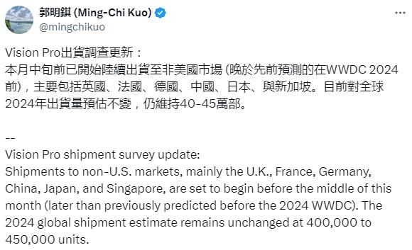 蘋果分析師郭明錤稱,蘋果供應(yīng)鏈將于6月中旬開始向美國(guó)以外的國(guó)家運(yùn)送Apple Vision Pro。
