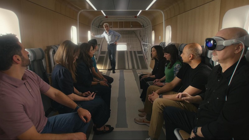 在WWDC 24的預(yù)熱視頻中,Vision Pro就十分搶鏡。Mike Rockwell戴著Vision Pro端坐機(jī)艙內(nèi),等待與同事一同跳傘進(jìn)入蘋(píng)果總部Apple Park。鏡頭還專門(mén)給Rockwell來(lái)了一個(gè)特寫(xiě),顯露出了濃濃的宣傳意味。