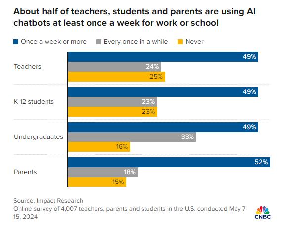 在實(shí)際使用方面也出現(xiàn)了類似的激增,46%的教師和48%的學(xué)生表示每周至少使用一次 ChatGPT,學(xué)生的使用率比去年上升了27個(gè)百分點(diǎn)。