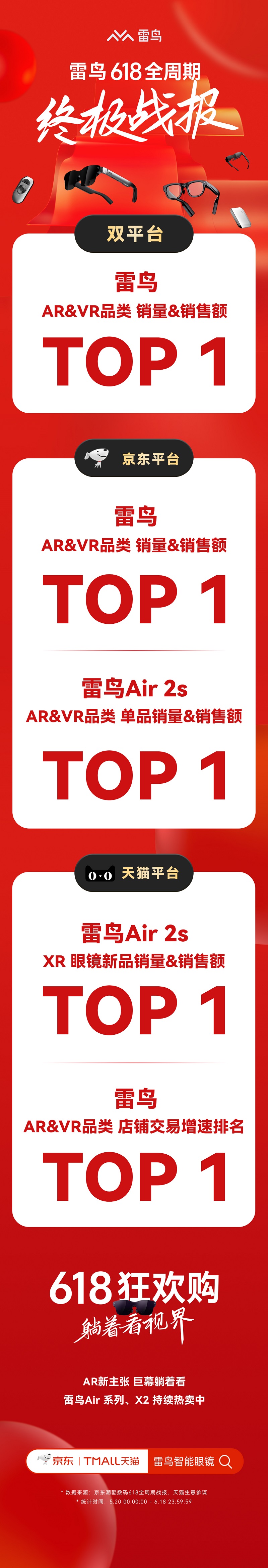 最新戰(zhàn)報(bào)傳來,雷鳥創(chuàng)新旗下雷鳥AR眼鏡京東、天貓 雙平臺大獲全勝!不僅斬獲AR&VR品類618全周期TOP 1 !新品雷鳥Air2s躺躺鏡開售后持續(xù)19天霸榜XR眼鏡新品TOP 1!