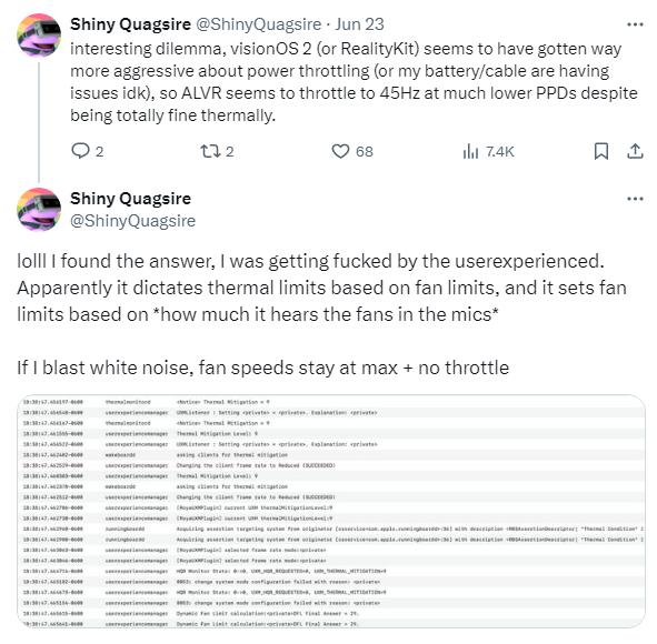 一位VR開發(fā)者發(fā)現(xiàn)了不同尋常的Apple Vision Pro設(shè)定冷卻風(fēng)扇速度從而限制散熱性能的工作原理。