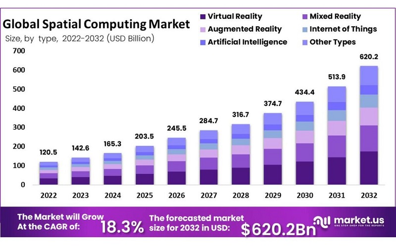 根據(jù)研究機(jī)構(gòu)Market.US在2024年3月發(fā)布的一份報(bào)告顯示,全球空間計(jì)算的市場(chǎng)規(guī)模(包含VR、MR、AR、物聯(lián)網(wǎng)、人工智能等)將從2023年的1426億美元,增長(zhǎng)到2032年的6202億美元。