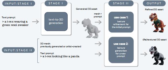 文本到3D是指從文本生成3D內(nèi)容,如角色、道具和場景的問題描述。創(chuàng)作3D內(nèi)容是設計中最耗時和最具挑戰(zhàn)性的方面之一,涉及開發(fā)游戲、增強現(xiàn)實和虛擬現(xiàn)實應用,以及電影中的特效等行業(yè)。通過可兼任為3D藝術(shù)家的3DGen,Meta可以實現(xiàn)以新體驗為中心創(chuàng)建個性化的、用戶生成的3D內(nèi)容。