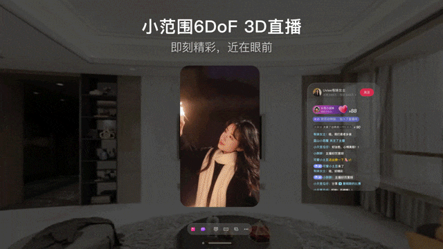 「抖音VR直播」Vision Pro版使“美好觸手可得”,視線所及實現(xiàn)6DoF內(nèi)容追蹤,讓3D直播破框融入真實世界,帶來立體看播新體驗。
