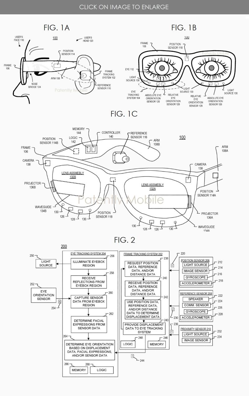 Meta專利下圖1A、1B和1C示出了配置為使用幀追蹤來提高眼動(dòng)追蹤精度的頭戴式設(shè)備的示例圖;圖2示出了追蹤系統(tǒng)環(huán)境的示例流程圖。