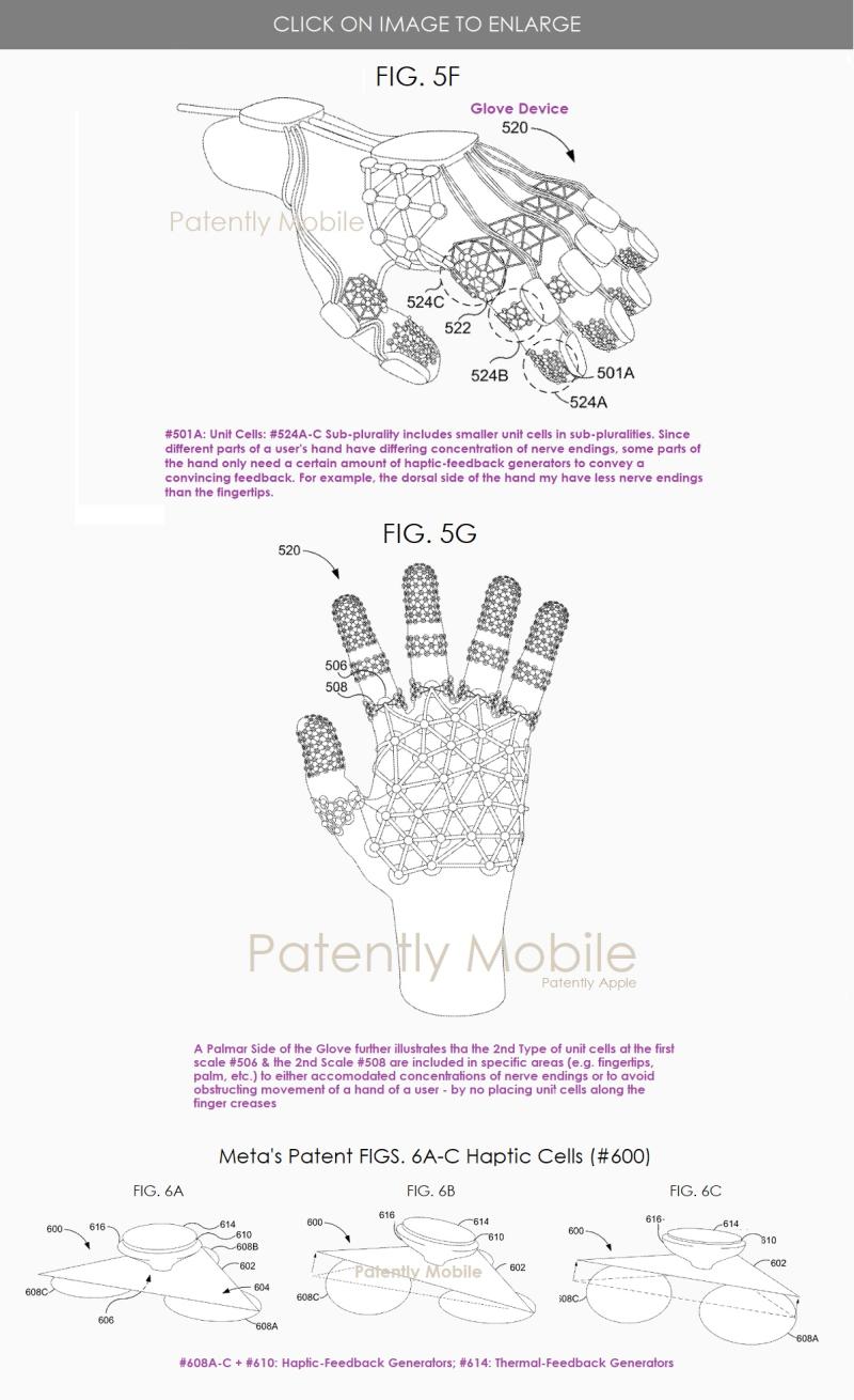 Meta專利圖5F下方示出了可穿戴手套裝置#520,其包括多個第二類型的單元#501A-501E。可穿戴手套裝置包括不同比例(例如,大單元522)的第二類型單元#501A-501E,這對于制造目的可能是有益的。例如,子復(fù)數(shù)#524A包括的單元尺寸小于子復(fù)數(shù)#524B和524C中的單元尺寸。在一些實施例中,第一比例的第二類型的單元仍然與第二比例的第二類型的單元耦合,其中第二比例小于第一比例。