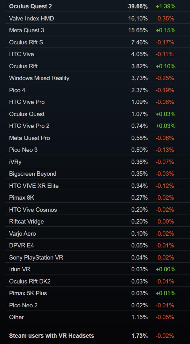 本月Meta陣營(yíng)設(shè)備占比為68.27%(+1.43%)。細(xì)分來(lái)看,Meta Quest 2占比為39.66%(+1.39%),Meta Quest 3升至15.65%(+0.15%),Oculus Rift S為7.46%(-0.17%)、DK2為0.03%(-0.01%)、Meta Quest Pro為0.58%(-0.06%)、Quest為1.07%(+0.03%)、Oculus Rift為3.82%(+0.10%)。