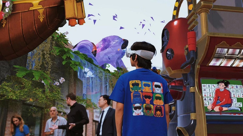 與以往的VR大空間項目不同,《山海空間》是基于蘋果Vision Pro進(jìn)行設(shè)計與開發(fā)的,其體驗場地也不是傳統(tǒng)的室內(nèi)環(huán)境,而是面積達(dá)數(shù)千平米的798步行街主干道。全新的硬件終端、戶外場地、超大面積等諸多特點使其成為國內(nèi)甚至全球范圍第一個“吃螃蟹”的大空間Vision Pro項目。