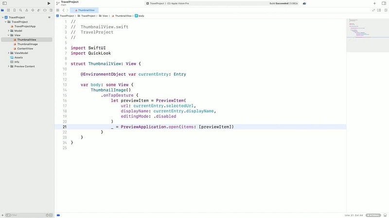 在.onTapGesture中,首先創(chuàng)建一個(gè)PreviewItem,傳入3D對(duì)象URL,然后調(diào)用PreviewApplication.open,傳入創(chuàng)建的預(yù)覽項(xiàng)。