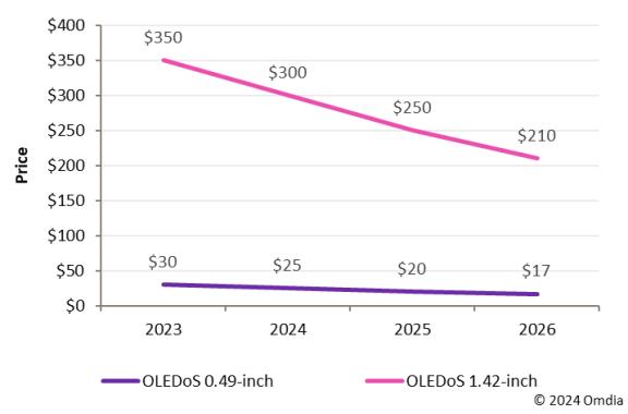 Omdia表示,當蘋果開始量產(chǎn)Vision Pro時,1.42英寸微型OLED面板的成本約為每塊350美元;隨著產(chǎn)量的增加,經(jīng)過談判,成本現(xiàn)已降至每塊約300美元。