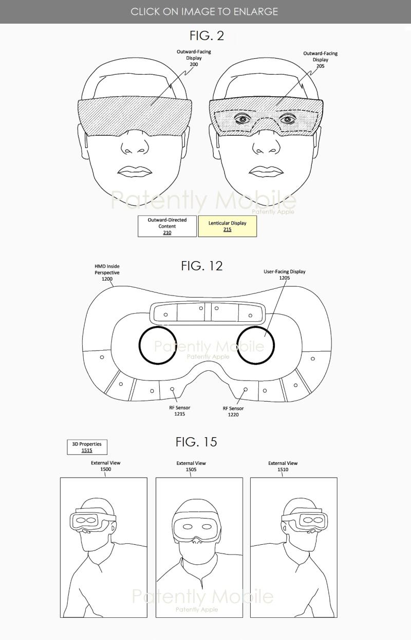 微軟專利圖12說明了MR設(shè)備如何配備任意數(shù)量的射頻(RF)傳感器來測量某些導(dǎo)電材料(例如,用戶體內(nèi)含鹽液體)的位移;圖15說明了外向顯示器如何以顯示內(nèi)容的方式顯示內(nèi)容,就好像顯示的內(nèi)容具有三維屬性一樣。