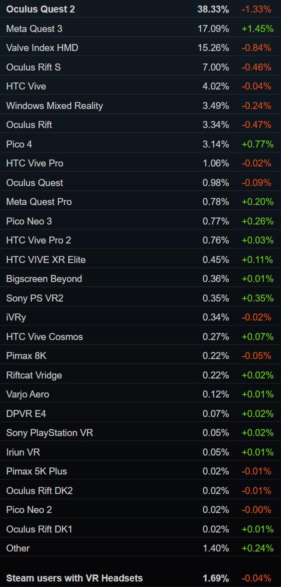 本月Meta陣營設(shè)備占比為67.56%(-1.49%)。細分來看,Meta Quest 2占比為38.33%(-1.33%),Meta Quest 3升至17.09%(+1.45%),終于超過Valve Index名列第二;Oculus Rift S為7.00%(-0.46%)、Oculus Rift為3.34%(-0.47%)、Meta Quest Pro為0.78%(+0.20%)、Quest為1.06%(-0.02%)、DK2為0.02%(-0.01%)、DK1為0.02%(+0.01%)。