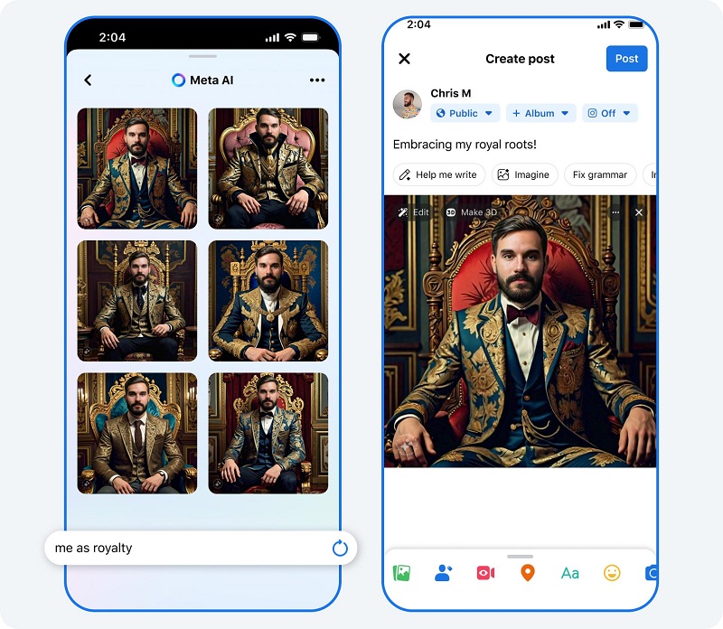 Meta正在擴展Meta AI的Imagine功能,因此你現(xiàn)在可以在動態(tài)消息、故事和Facebook個人資料圖片中將自己想象成超級英雄或其他任何角色。然后,你可以輕松分享AI生成的圖像,以便朋友可以查看、做出反應(yīng)或進行模仿。Meta AI還可以為你在Facebook和Instagram 上的故事推薦標題。