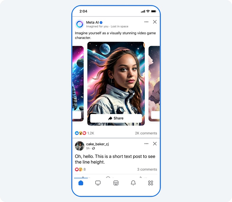 Meta正在Facebook和Instagram動態(tài)中測試Meta AI生成的新內(nèi)容,因此你可能會看到Meta AI專門為你創(chuàng)建的圖像(基于興趣或當前趨勢)。你可以點擊建議的提示將該內(nèi)容帶入新的方向,或滑動以實時想象新內(nèi)容。