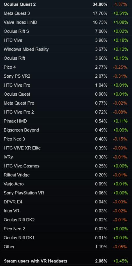 近日,Steam平臺(tái)公布了2024年10月的軟件與硬件調(diào)查報(bào)告。本月報(bào)告數(shù)據(jù)顯示,Steam平臺(tái)VR用戶占比在10月份升高至2.05%(+0.45%),出現(xiàn)了較大幅度的反彈。從數(shù)據(jù)來(lái)看,或許是受到「亞利桑那陽(yáng)光重制版」在Steam平臺(tái)上線的影響,本月PC VR用戶群體占比上漲明顯,Valve Index、Rift及Rift S、HTC Vive、WMR頭顯、小派Pimax頭顯、Bigscreen Beyond均有不同程度的漲幅。