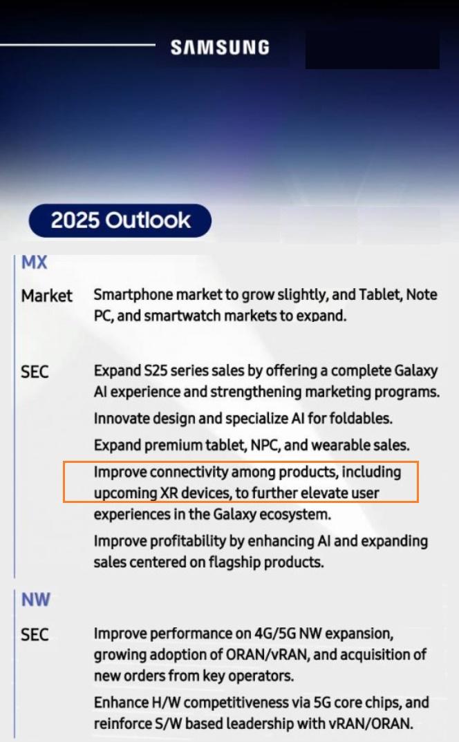 IDC分析師Bryan Ma表示,三星在最近為投資者舉行的演示中提供了關(guān)于XR設(shè)備明確的線索。在2025年展望標(biāo)題下,有一段文字寫道:“改善產(chǎn)品之間的連接性,包括即將推出的X設(shè)備,以進一步提升Galaxy生態(tài)系統(tǒng)用戶體驗”。