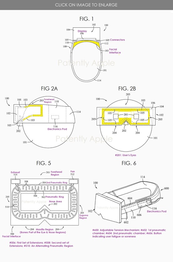 為解決佩戴舒適問題,蘋果發(fā)明涉及一種帶有一個或多個流體室(例如氣動室或環(huán))的頭戴式設備。流體室可以放置在面部面板上或面部面板內(nèi)。在這種配置中,流體室可以在面部面板和用戶面部之間提供不同的接觸點。這樣,流體室可以幫助防止壓力點,并在佩戴設備時動態(tài)改變力分布曲線,以幫助減少用戶疲勞(特別是在長時間使用的情況下)。