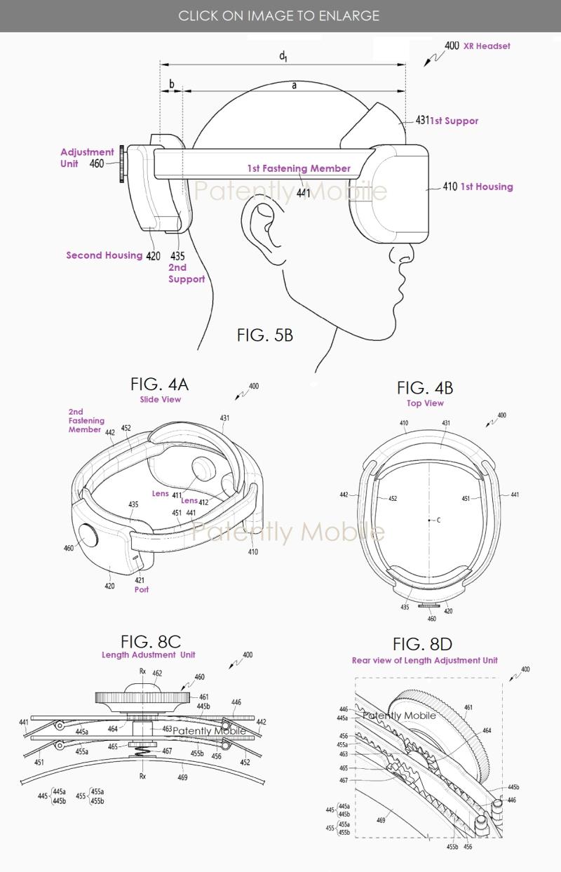 三星專利下圖5B示出可穿戴設(shè)備佩戴狀態(tài)的側(cè)視圖;圖4A為可穿戴設(shè)備的透視圖;圖4B為可穿戴設(shè)備的平面圖。