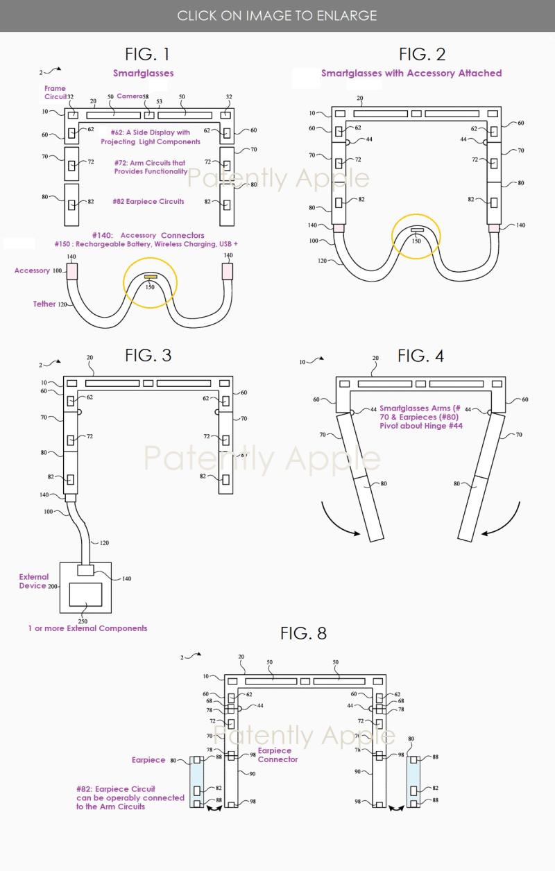 美國專利局公布了蘋果一項專利申請,該專利申請涉及未來智能眼鏡,該眼鏡能夠?qū)⑴浼B接到眼鏡框上,包括某種形式的音頻設(shè)備、防止眼鏡在運(yùn)動時掉落的系繩等等。