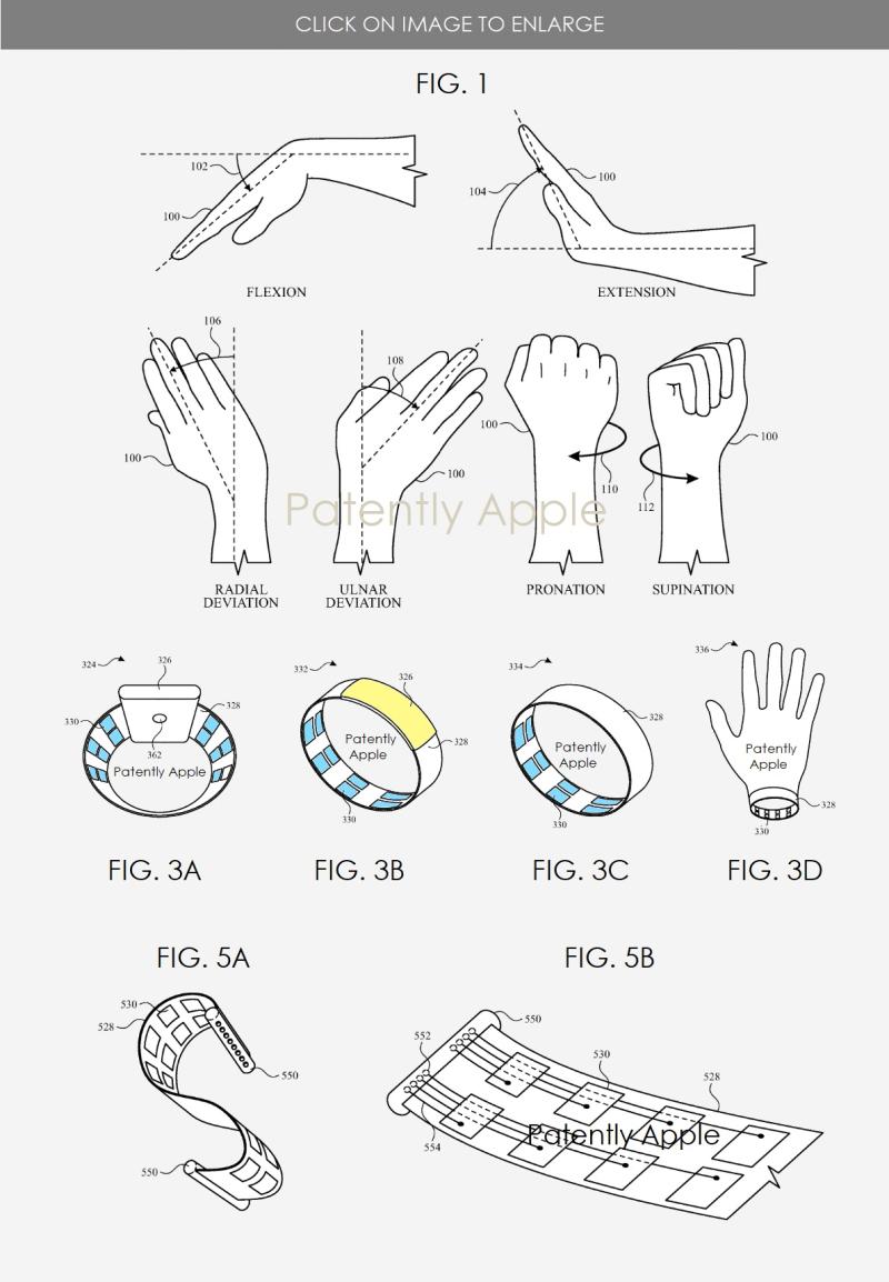 蘋(píng)果專(zhuān)利圖1說(shuō)明了可作為手勢(shì)執(zhí)行的各種手部動(dòng)作;圖3A-D說(shuō)明了可以在柔性帶中形成電極以檢測(cè)手部動(dòng)作和手勢(shì)的示例設(shè)備;圖5A說(shuō)明了已與其外殼分離的示例柔性帶(Apple Watch +);圖5B說(shuō)明了表帶的一部分以及電極到連接器的布線。