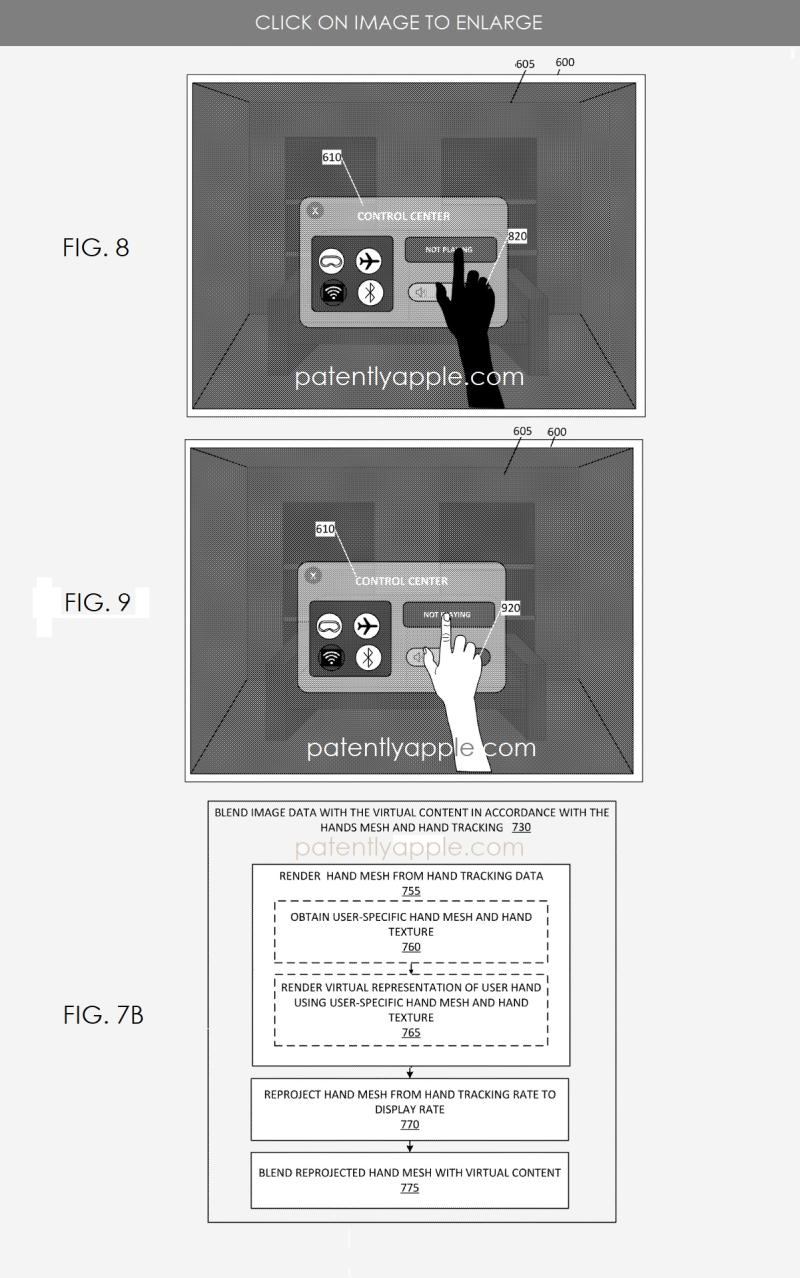 蘋果專利圖8顯示了包含渲染的手部網(wǎng)格和虛擬內(nèi)容的合成圖像視圖的示例圖;圖9顯示了包含手部虛擬表示和虛擬內(nèi)容的合成圖像視圖的示例圖。專利圖7B描繪了使用手部網(wǎng)格將攝像頭捕捉的圖像數(shù)據(jù)與虛擬內(nèi)容混合的示例流程圖。