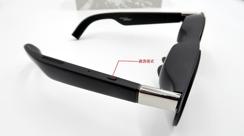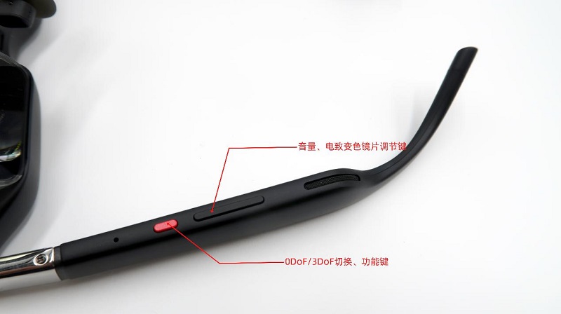 功能按鈕集中在右側鏡腿的上下方,用戶只需要單手就能夠進行全部操作。上方為通透模式按鈕,可以一鍵將電致變色鏡片調節(jié)為透過率最高的檔位并隱藏眼鏡的畫面顯示,讓你能夠看清眼前的環(huán)境。下方則是主菜單鍵以及音量與電致變色鏡片的控制按鈕。用于連接數據線的USB Type-C接口位于左側鏡腿末端的位置。