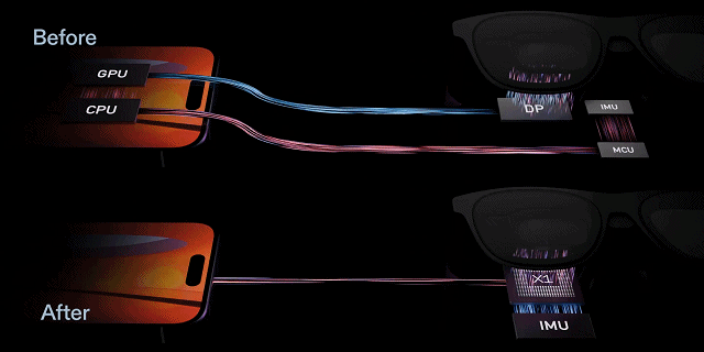 XREAL歷時3年時間自研的X1芯片,帶來了全新的數據傳輸鏈路,從原本 “6個信號處理節(jié)點+5端傳輸路徑”大幅縮減至 “3個信號處理節(jié)點+2端傳輸路徑”,并且完全在眼鏡端實現,從而大大降低了鏈路M2P延遲,提升了3DoF空間屏的穩(wěn)定性。