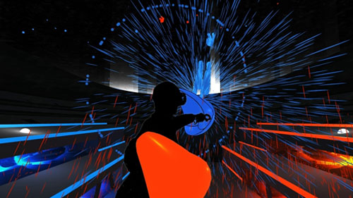 《音盾(Audioshield)》是一款在VR游戲界大名鼎鼎的音樂節(jié)奏類游戲,在Steam上的售價為68元。游戲玩法很簡單,玩家兩只手上的手柄會變?yōu)樽o(hù)盾,左手藍(lán)色,右手橘紅色,當(dāng)雙手合十則會出現(xiàn)紫色的護(hù)盾。而伴隨著音樂,會從天空的不同位置飛來藍(lán)色、橘紅色、紫色的音波,用護(hù)盾擋住對應(yīng)顏色的音波即可。小編在體驗(yàn)這款游戲的時候,感覺就像做了一套完整的廣播體操,一會仰著,一會兒蹲著,一會彎著腰……玩久了或許能減肥也說不定呢!試想一下,當(dāng)你逛商場的時候,看到一家VR體驗(yàn)店內(nèi)的顧客擺著各種奇葩的姿勢,甭管你內(nèi)心有多尷尬,但肯定也會多留意幾眼吧!