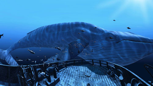 目前游戲一共有3個場景,其中一個是欣賞魚兒、水母的場景,尤其是當(dāng)水母群從你身邊游過,成群結(jié)隊(duì)的熒光會讓整個海底都變得絢麗多彩。另一個場景是在一片漆黑的海底,初入時會覺得有點(diǎn)恐怖。手柄則會充當(dāng)手電筒的功能,照亮前方一塊區(qū)域。在這里你可以看到神秘的燈籠魚和一些其他小魚。當(dāng)然《theBlu》最有名的就是鯨魚的場景啦!此場景的你會站在一艘海底沉船之上,先是看到很多海洋生物,過一會就會從遠(yuǎn)方游來一條巨大的鯨魚。當(dāng)它到達(dá)你身邊的時候,小編真的要說:“Amazing??!”