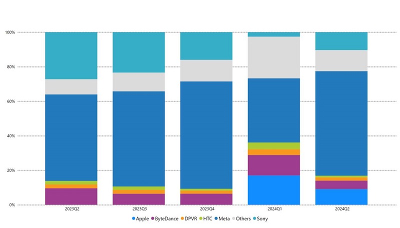 索尼PS VR2位居第二(占比6.7%),蘋(píng)果、PICO和XREAL產(chǎn)品占據(jù)前五名,三者合計(jì)占據(jù)了90%的市場(chǎng)份額。
