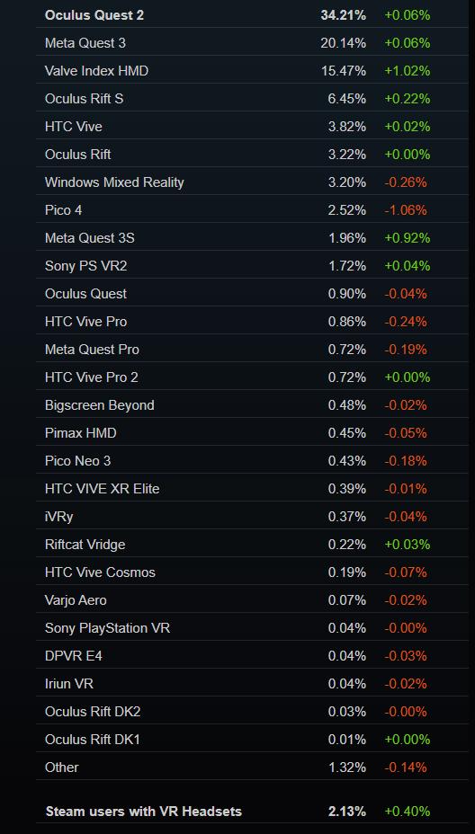 近日,Steam平臺公布了2024年12月的軟件與硬件調查報告?;蛟S是受到了圣誕節(jié)假期的影響,本月報告數據顯示,Steam平臺VR用戶占比在12月份升高至2.13%(+0.40%),其中Valve Index占比漲幅最高,上漲至15.47%(+1.02%);其次則是Meta Quest 3S,盡管剛剛入榜,用戶占比就從1.04%上漲至1.96%(+0.92%),幾乎翻倍。