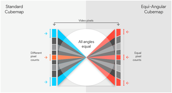 有了立方體地圖,使一個球變成一個立方體并展開,這是對等距離投影的改進(jìn),但它仍然導(dǎo)致像素密度顯著變化,立方體面的中心接近球體,而角落則遠(yuǎn)離。傳統(tǒng)的立方體地圖具有不同長度的樣本,取決于樣本在立方體面上的位置。EAC被運(yùn)用于保持長度相等,均勻分配像素。