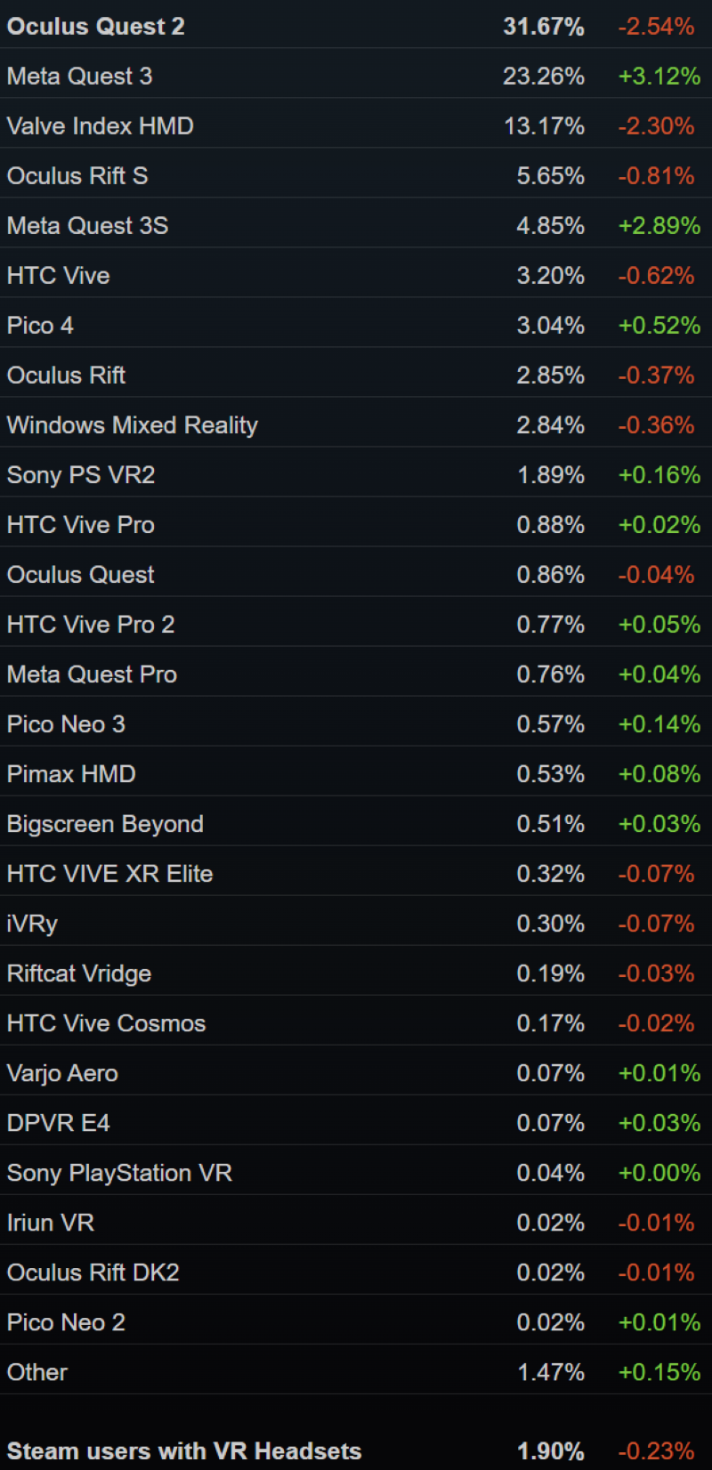 這意味著Valve數(shù)據(jù)中Quest 3S的4.85%僅代表那些使用其Steam Link應(yīng)用體驗(yàn)Quest的用戶,而Quest 3的23.26%包括來自Quest Link和Virtual Desktop的Quest 3S。因此,我們可以準(zhǔn)確說,Quest 3和3S加起來占了28.11%。