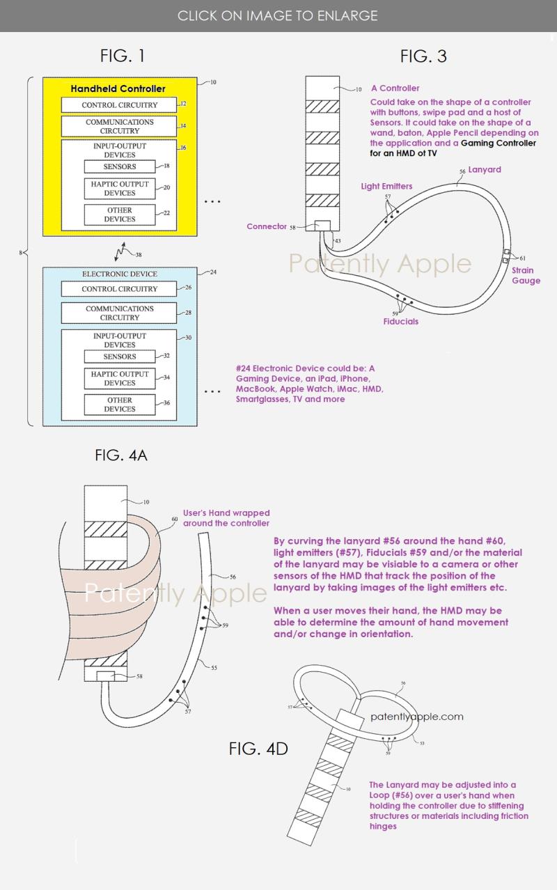 蘋果指出,掛繩可以可拆卸連接到手持輸入設(shè)備上。掛繩包括視覺標記,例如紅外發(fā)光二極管和/或基準點,這些標記可以通過外部攝像頭檢測并用于追蹤掛繩的位置、方向和/或運動。