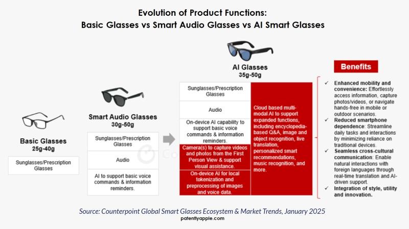Counterpoint Research將智能眼鏡定義為可穿戴計算機設(shè)備,其將電子元件集成于傳統(tǒng)眼鏡之中,以提供超越標準眼鏡的“智能”功能。從廣義來講,任何具備此類功能的眼鏡均屬于智能眼鏡范疇。不過,在更為狹義的語境下,“智能眼鏡” 一詞通常不包括支持AR的設(shè)備,后者被單獨歸類為AR眼鏡。在Counterpoint的報告中,智能眼鏡僅指不具備透視顯示屏和光學系統(tǒng)的眼鏡。