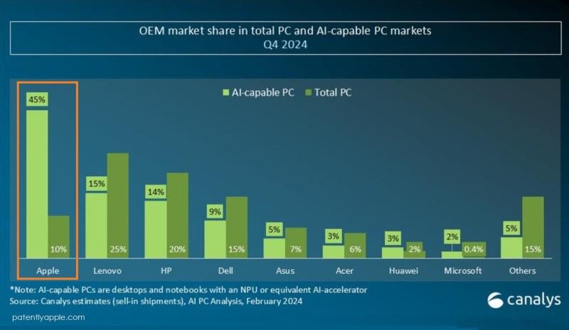 這類設(shè)備的日益普及使得此類個人電腦的出貨量環(huán)比增長了18%。2024年全年,17%的個人電腦出貨量支持人工智能。其中,蘋果成為最大贏家,占據(jù)了54%的份額,緊隨其后的是聯(lián)想和惠普,各占12%的份額。