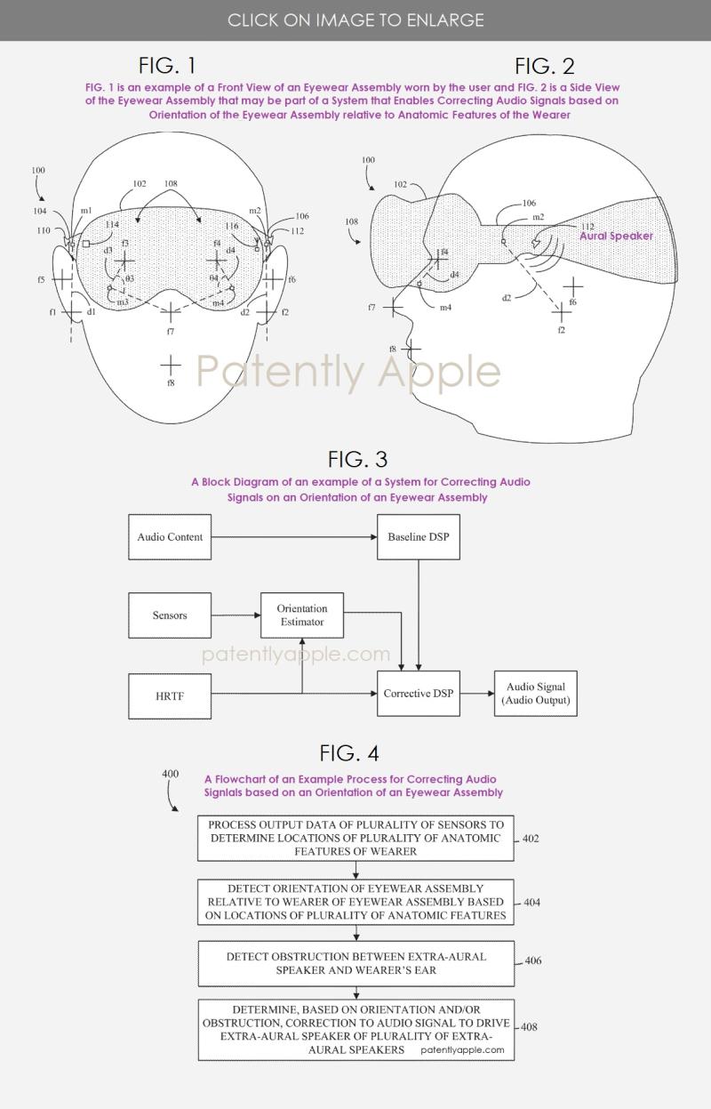美國專利局公開了蘋果一項(xiàng)專利申請,該申請聚焦于驅(qū)動(dòng)至耳外揚(yáng)聲器的音頻信號(hào)領(lǐng)域。具體而言,其核心在于依據(jù)眼鏡組件的方向,對傳輸至眼鏡組件耳外揚(yáng)聲器的音頻信號(hào)進(jìn)行校正。