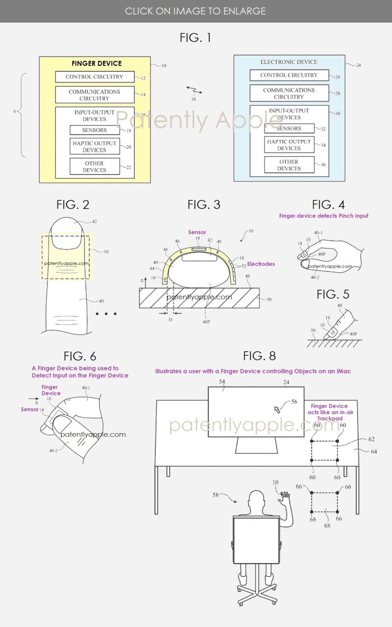 該專利其涵蓋范圍包括一種智能戒指,該戒指能夠收集用戶輸入并向用戶提供輸出。舉例來說,這種智能戒指(手指穿戴設備)內部或許配備有帶有加速度計的慣性測量單元,以此來收集諸如手指敲擊、自由空間內手指手勢等手指運動信息;可能裝配有力傳感器,用于收集手指設備與用戶手指間的法向力和剪切力信息;還可能搭載其他傳感器,用以收集手指設備(以及佩戴該設備的用戶手指)與周圍環(huán)境相互作用的相關信息。