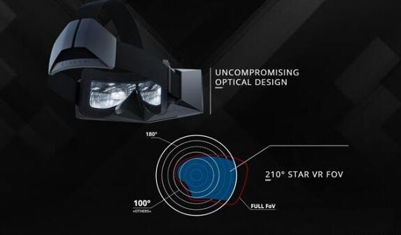 為了帶來最佳的鏡頭表現(xiàn)和佩戴體驗,StarVR有著一個非??犰诺募^形狀外觀。Starbreeze沒有使用傳統(tǒng)的VR眼鏡死板的長方形模塊,主要是因為他們認為箭頭形外觀可以使得用戶的視角達到最佳。從參數(shù)上看,StarVR 的FOV視角要比一般的VR眼鏡大的多,其水平和垂直的FOV分別是:210度和100度。再加上菲涅爾鏡片和5K級別(單眼2.5K)的分辨率,用戶可以體驗到非常清晰逼真的畫面。